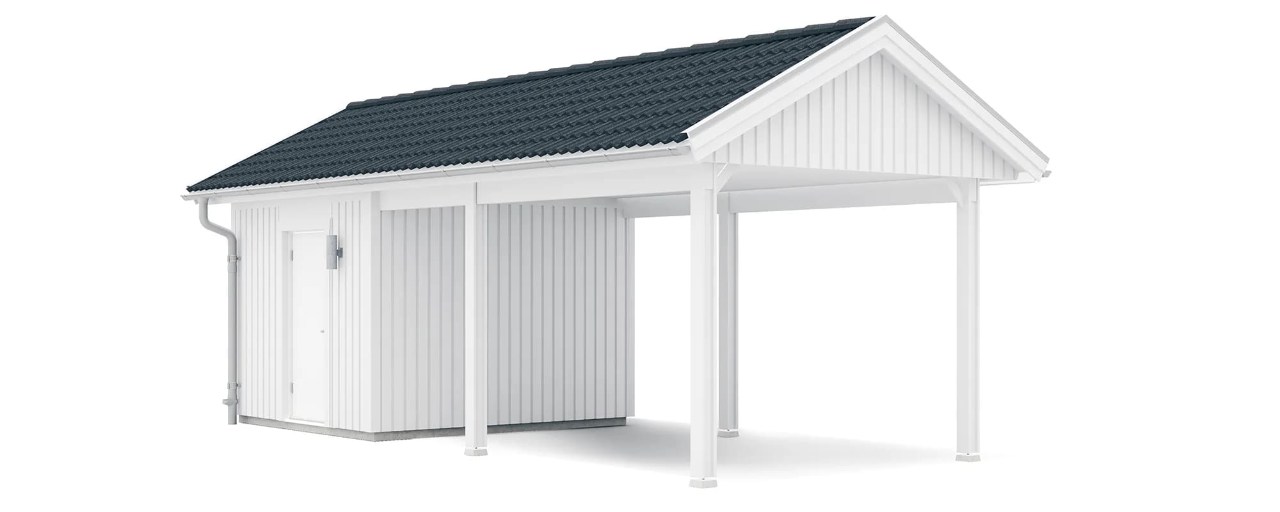 CP-29 är en fristående carport med tillhörande förråd med plats för en bil. Byggnadsarea 28.9 m² Byggnadshöjd 3 m Nockhöjd 3.9 m