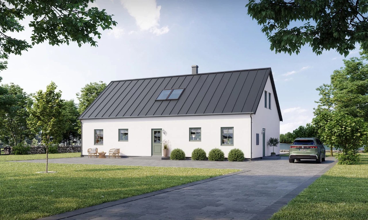 Det här rymliga huset är stilrent utformat med klassisk fasad och sadeltak. Interiören präglas av ljuslinjer, genomsikt och en välgenomtänkt plan som gör det mesta möjligt. Drömmer du om eget bibliotek? Extra lekrum till barnen? Väntar ni en till i familjen, eller kanske övernattningssugna gäster? Med sex rum som standard, och möjlighet att utöka till sju, finns gott om utrymme att följa dina husdrömmar. På entréplan finns ordentliga sociala ytor för maximalt familjehäng. Välj till braskamin för att förhöja det traditionella myset ännu mer.